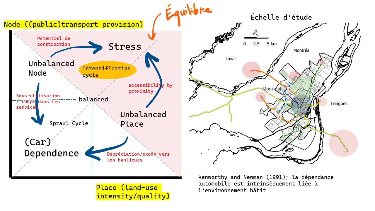 Newman et Kenworthy soutiennent que les villes nord-américaines demeurent structurées par une dépendance à l’automobile, caractérisée par de faibles densités, l’étalement urbain et des infrastructures dédiées à la circulation motorisée (Newman & Kenworthy, 2015). Le défi de la transition ne consiste donc pas seulement à réduire les déplacements en voiture, mais à mieux articuler usage du sol, accessibilité et dynamiques économiques. Les travaux sur les formes urbaines compactes et orientées vers le transport collectif (TOD) montrent que densité, mixité fonctionnelle, qualité des environnements piétons et proximité du transport collectif favorisent des mobilités plus durables et réduisent la consommation énergétique (Cervero & Duncan, 2006; Cervero & Kockelman, 1997; Ewing & Cervero, 2017; Niemeier et al., 2011).